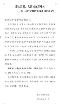 (通讯员:叶芬;审核:吴乐盈)在经济与管理学院这个充满温情的大家庭里,师生间的情谊宛如一条坚韧的纽带,紧密地将大家联系在一起。当得知2010级工商管理校友朱晨的女儿身患先天性心脏病,长期在icu与病魔抗争,其家庭被巨额医疗费用压得喘不过气的消息传来时,学院迅速行动,一场爱心接力就此展开。